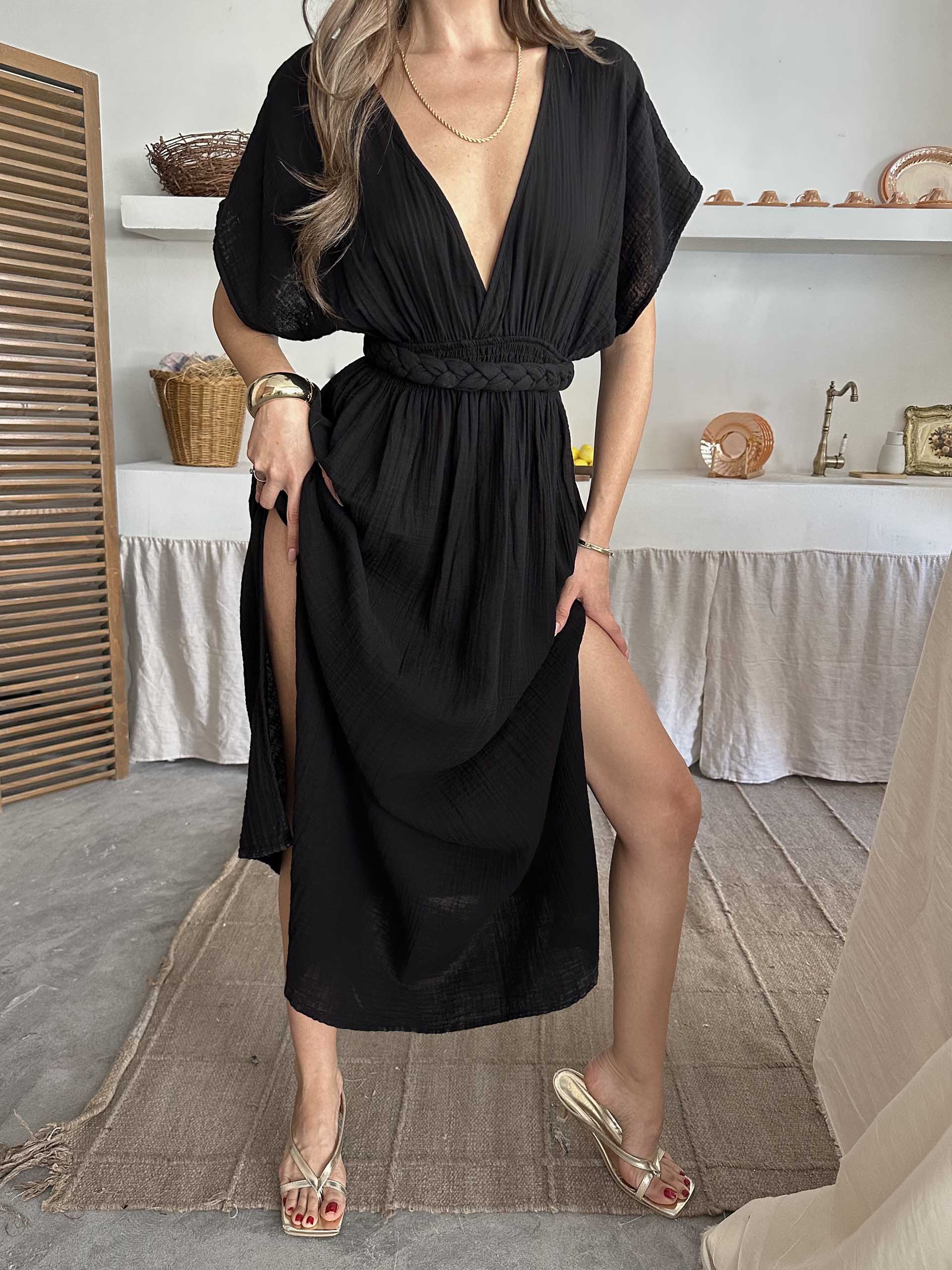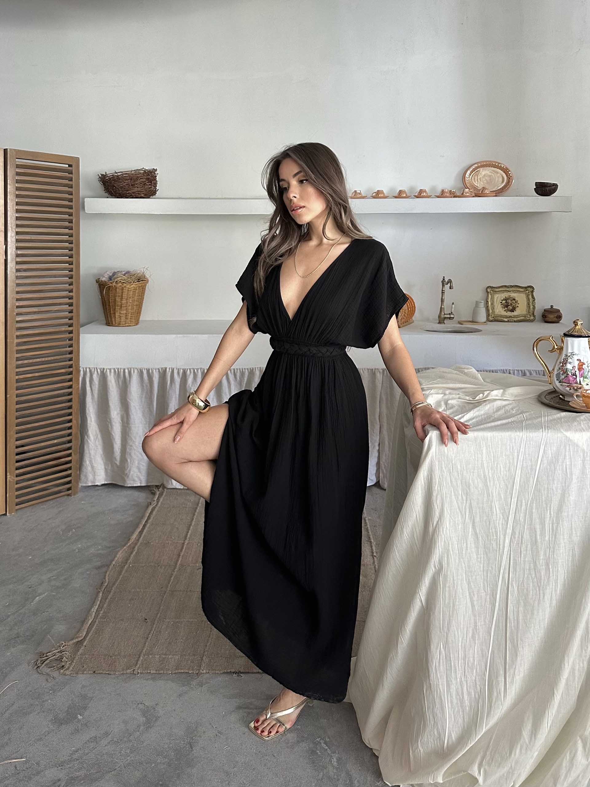 Emmy V Yaka Müslin Kumaş Elbise Siyah