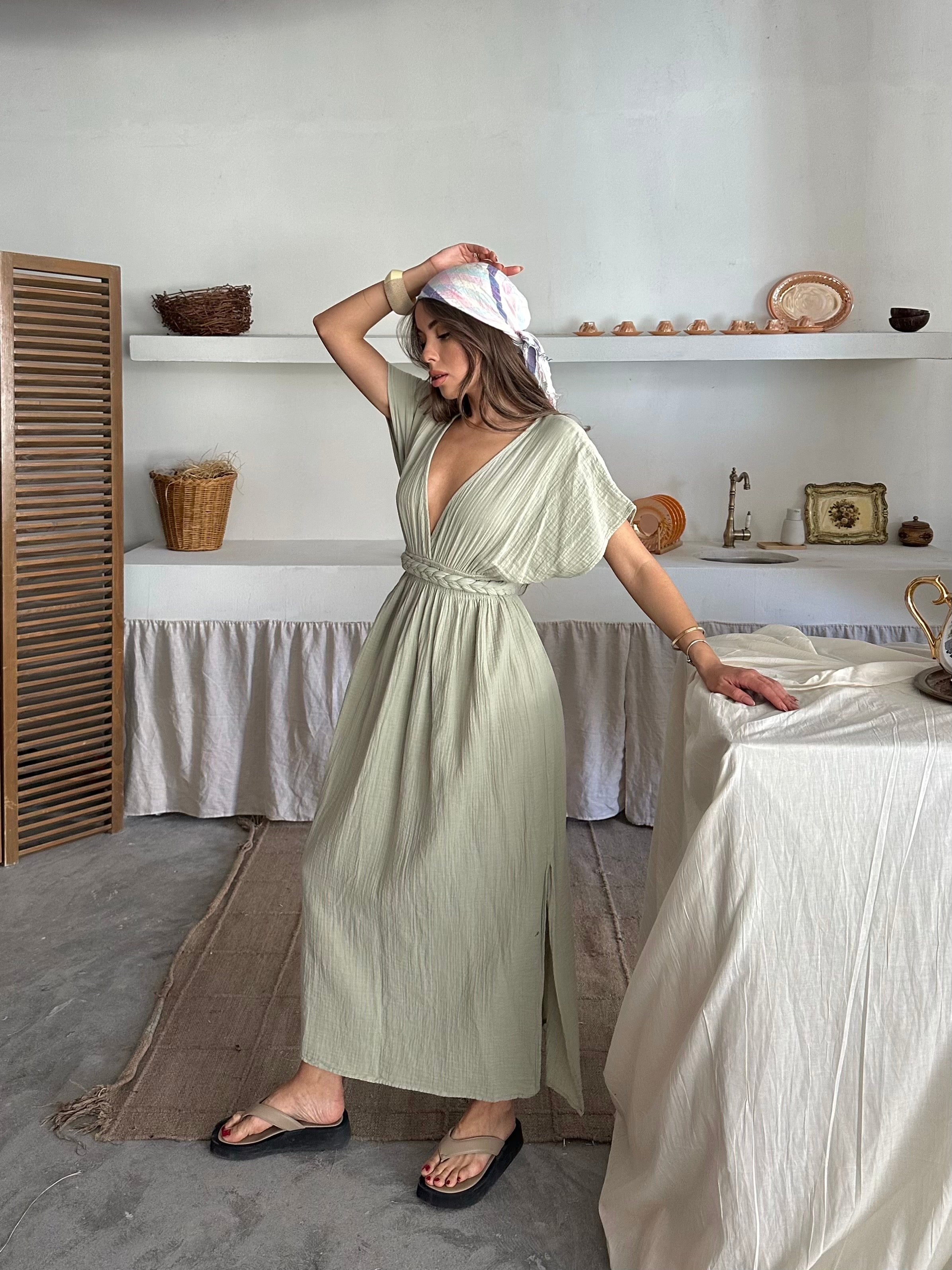 Emmy V Yaka Müslin Kumaş Elbise Mint
