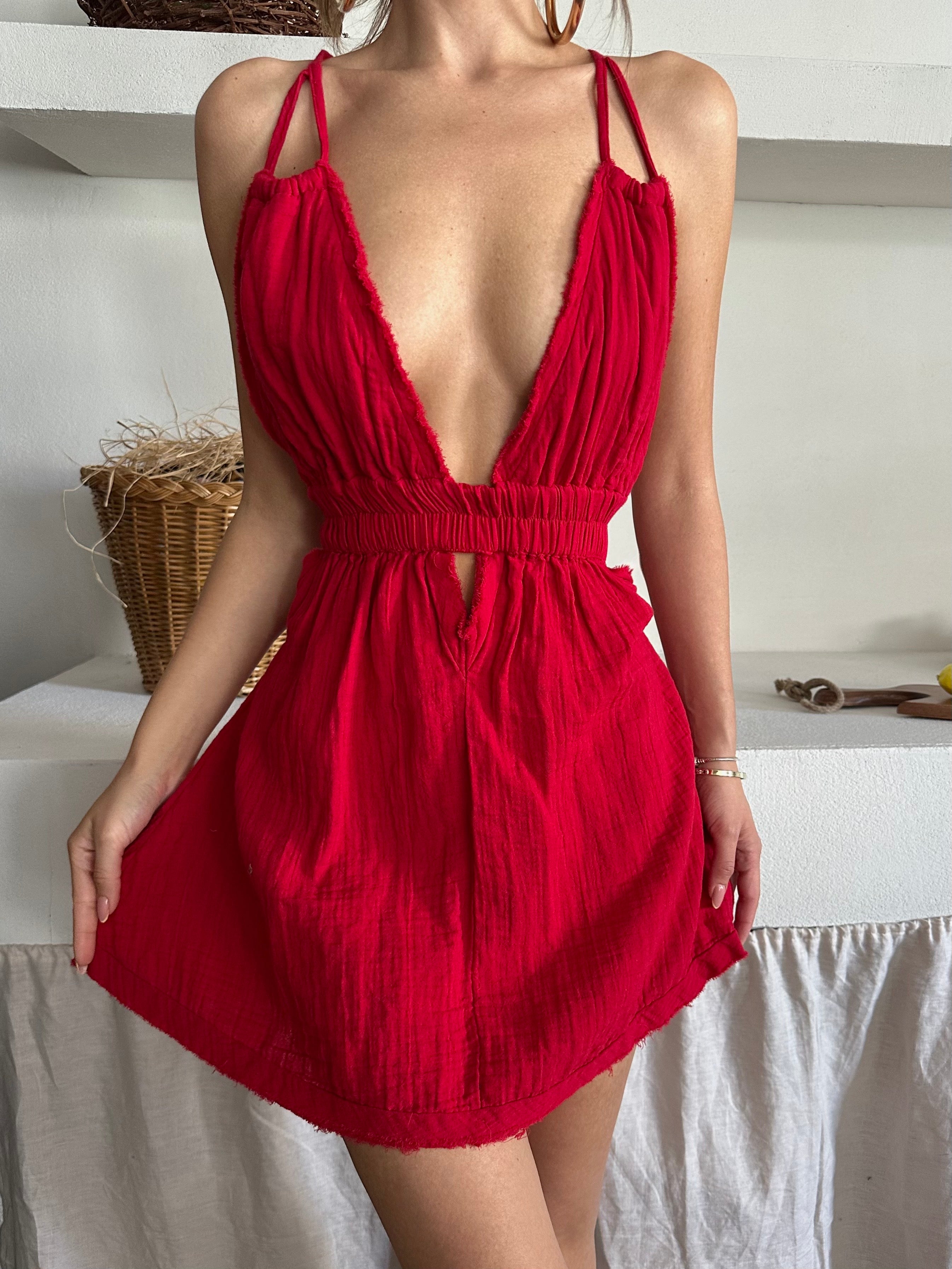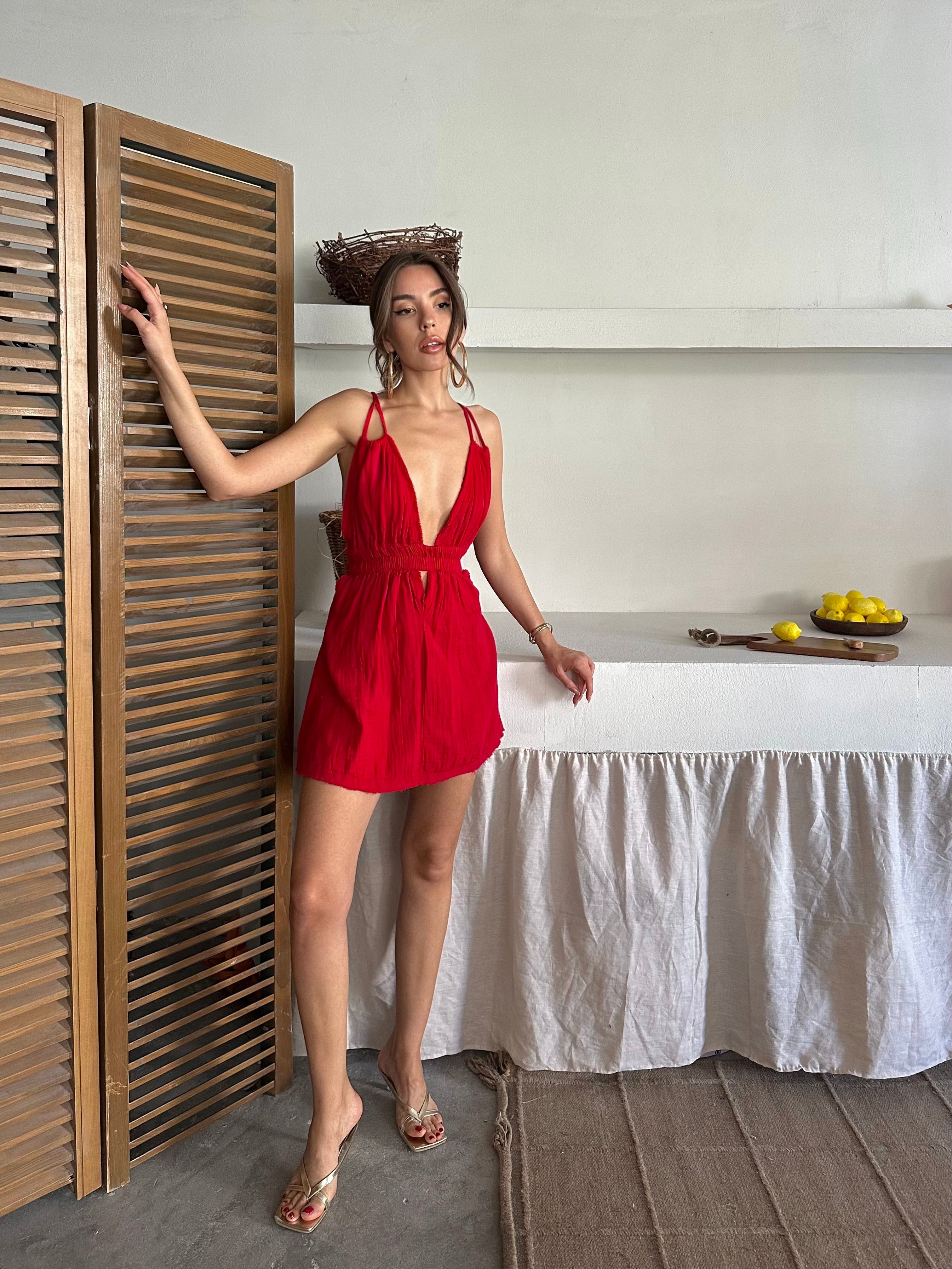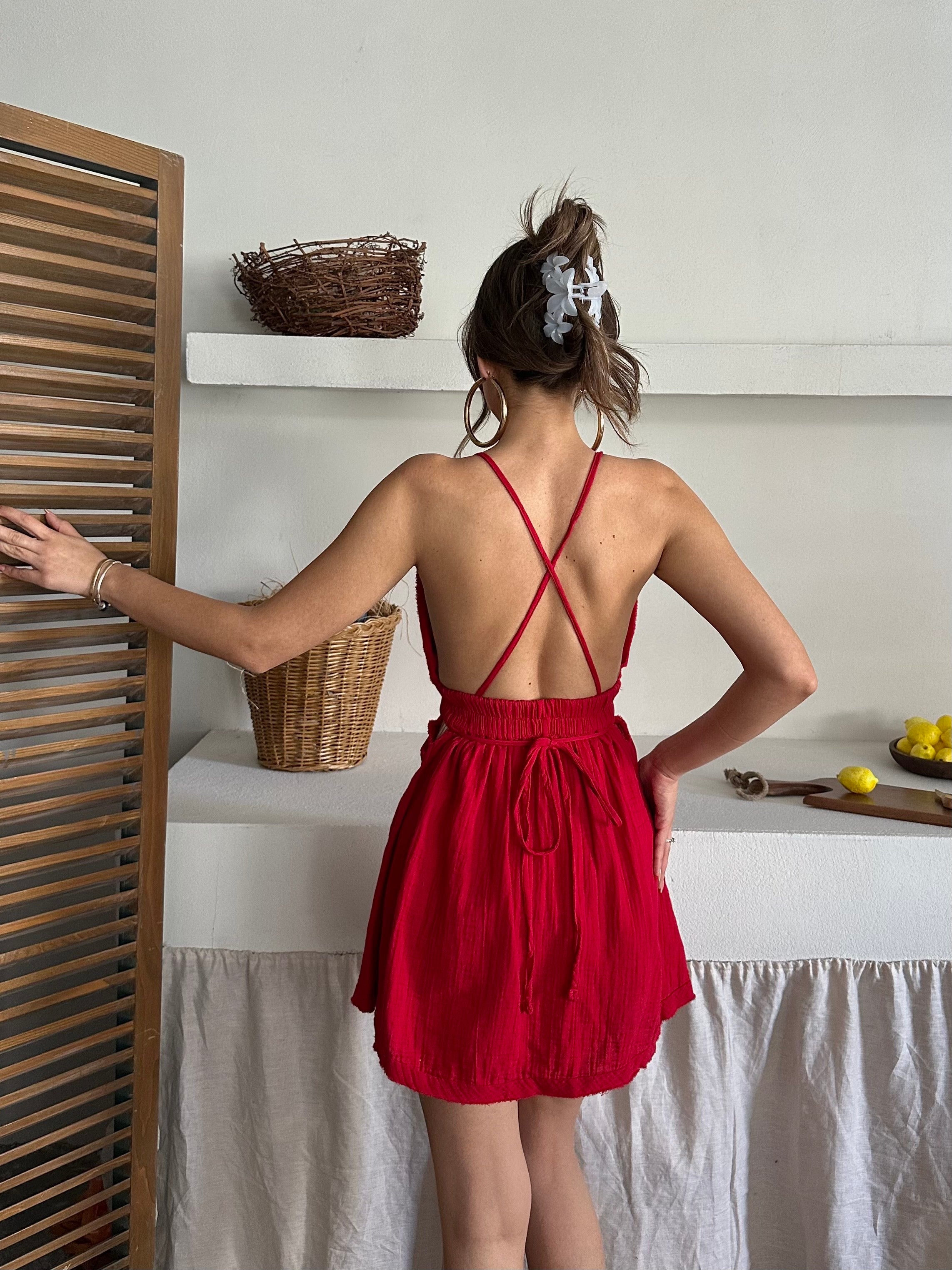 • Alfrida İp Askılı Müslin Kumaş Elbise Kırmızı