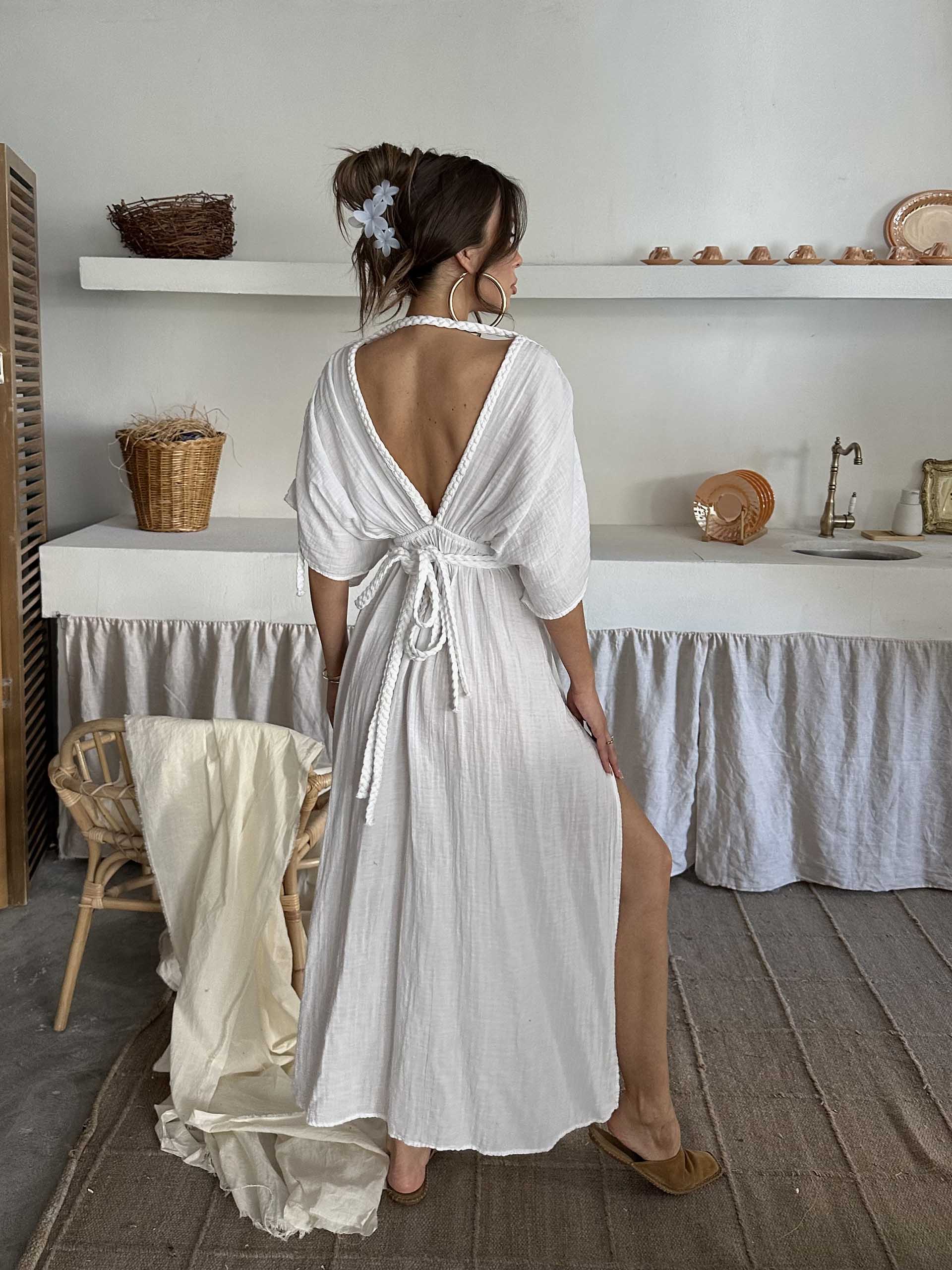 • Elisa V Yaka Müslin Kumaş Elbise Beyaz