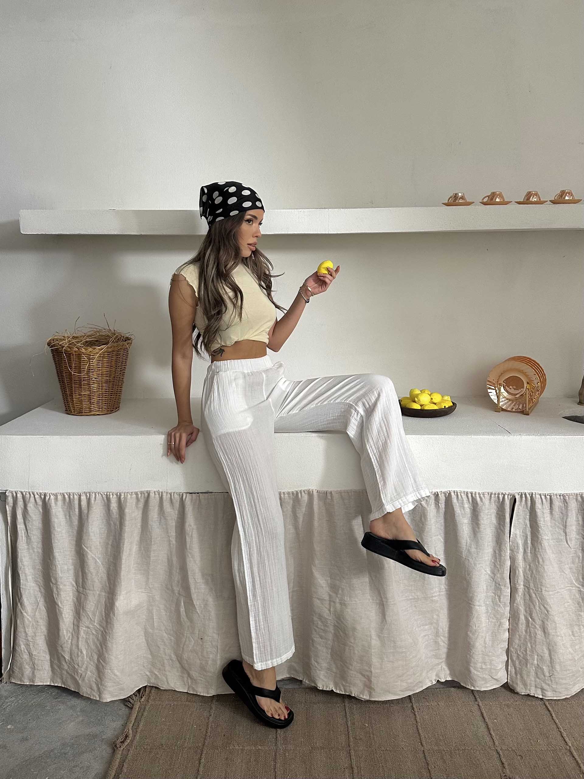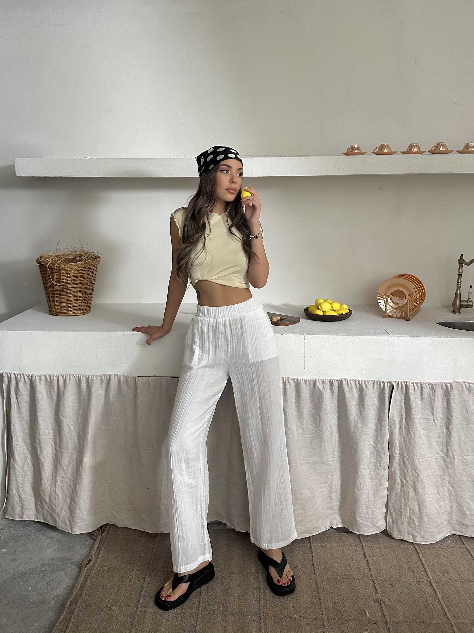 Talia Organik Müslin Kumaş Pantolon Beyaz