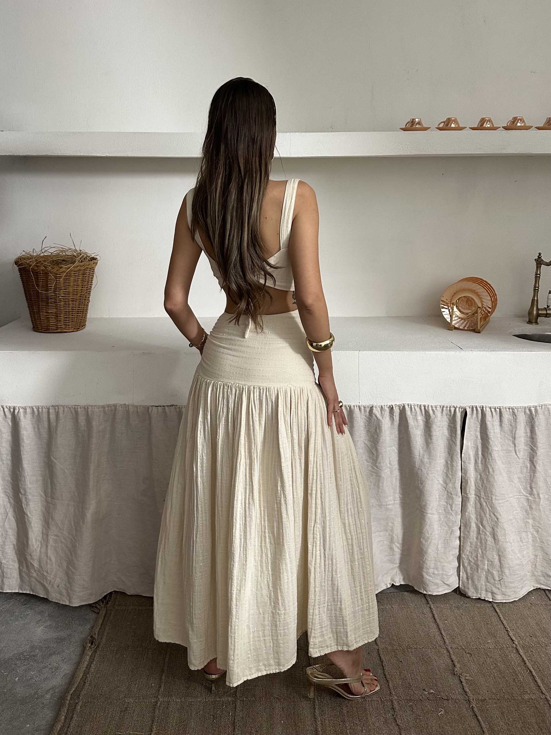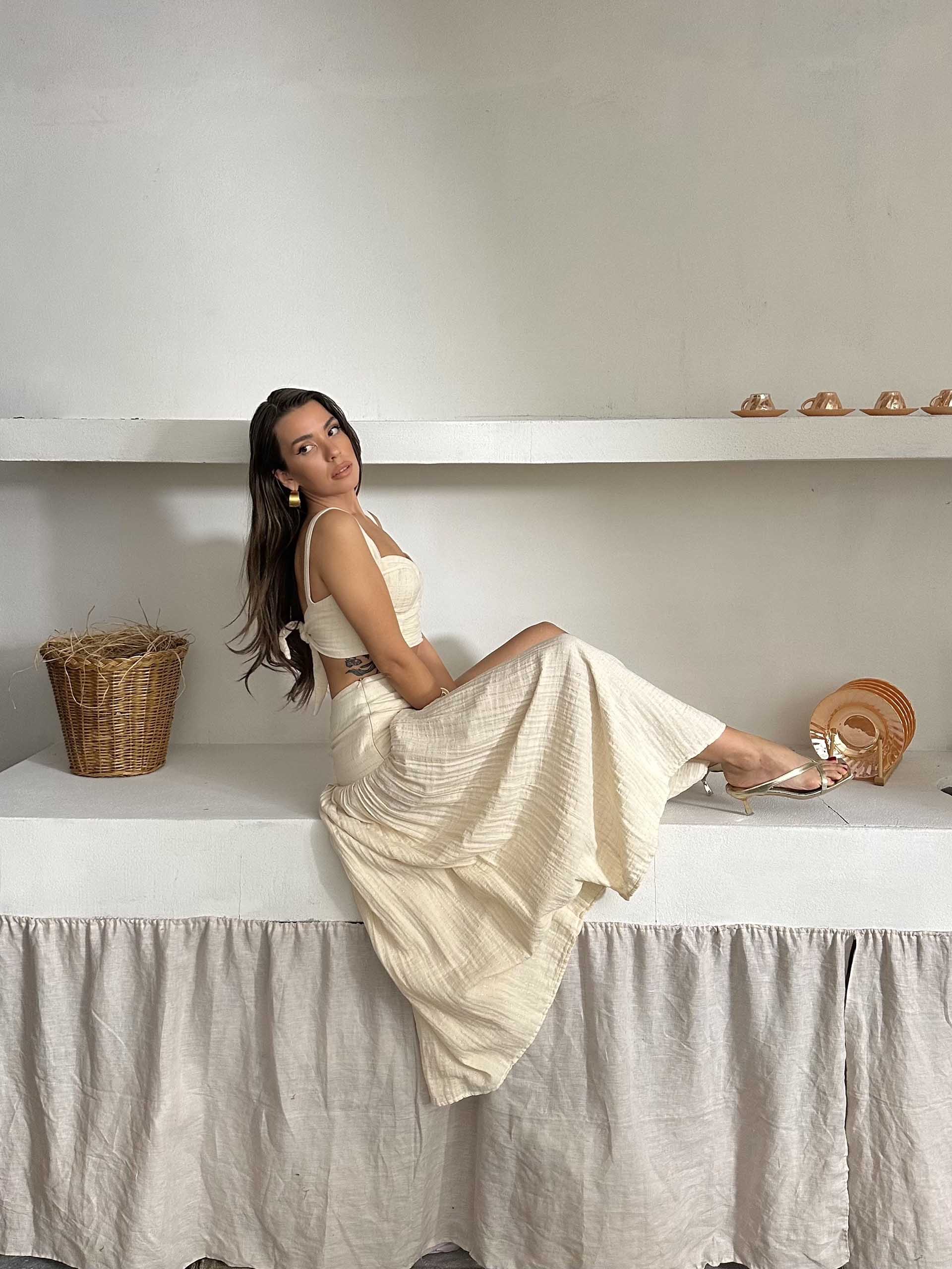 Emma Simli Etek Yırtmaç Detay Müslin Kumaş İkili Takım Bej